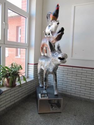 Zunächst wurden von einer Kunstlehrerin die Drahtrohlinge von Esel, Hund, Katze und Hahn aus Hasendraht vorgefertigt. Die notwendigen elektrischen Leitungen wurden in die Körper verlegt. Im Rahmen einer Kunst-Projektwoche formten die SchülerInnendie Körper aus Papp-Maché.